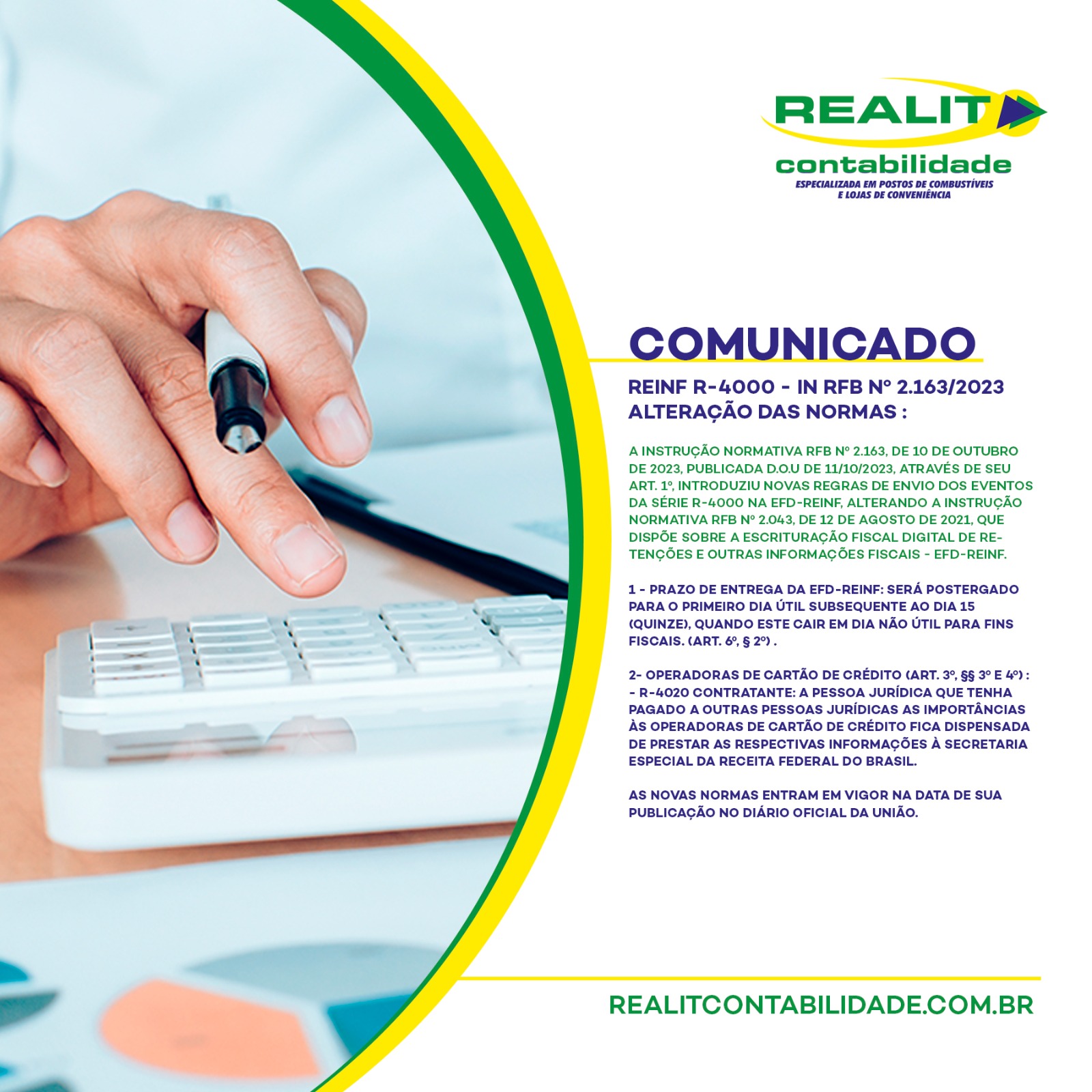 A Instrução Normativa RFB nº 2.163, de 10 de outubro de 2023, publicada D.O.U de 11/10/2023, através de seu art. 1º, introduziu novas regras de envio dos eventos da série R-4000 na EFD-REINF, alterando a Instrução Normativa RFB nº 2.043, de 12 de agosto de 2021, que dispõe sobre a Escrituração Fiscal Digital de Retenções e Outras Informações Fiscais – EFD-Reinf.