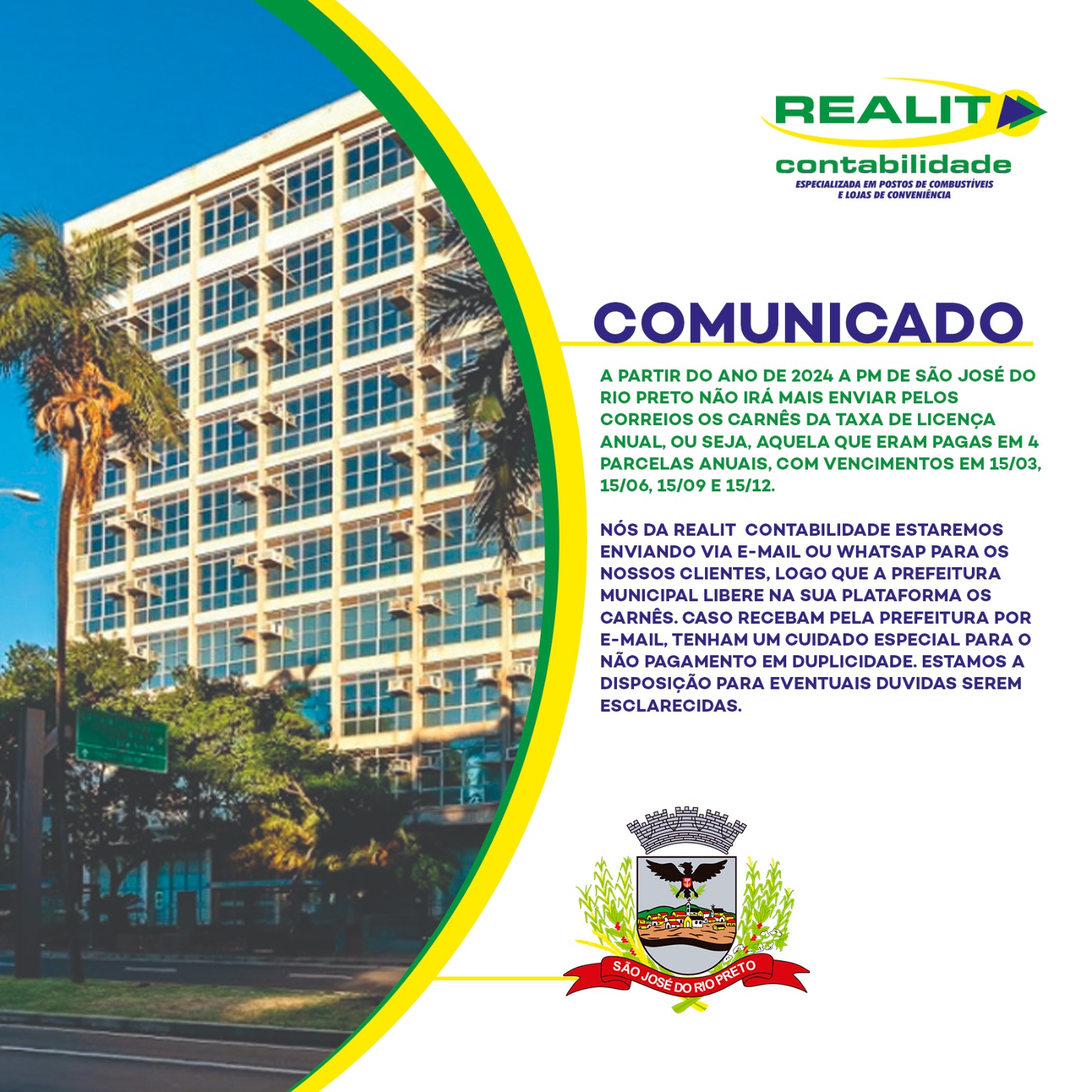 A partir do ano de 2024 a PM de São José do Rio Preto não irá mais enviar pelos correios os carnês da taxa de licença anual, ou seja, aquela que eram pagas em 4 parcelas anuais, com vencimentos em 15/03, 15/06, 15/09 e 15/12.